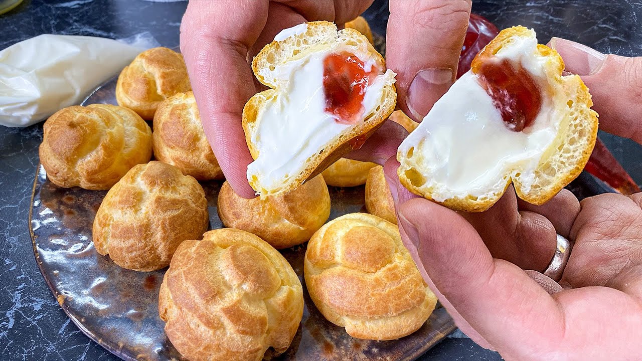Тесто заваривают на огне, затем вводят яйца, отсаживают небольшие порции на противень и выпекают около 20 минут. В процессе выпечки внутри образуется полость, которую позже заполняют начинкой.